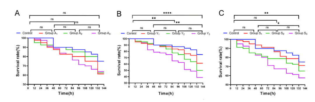 Tỷ lệ sống sót tích lũy của L. vannamei dưới ảnh hưởng của các mức độ stress do amoniac, nitrit và sunfua được trình bày trong Hình 1A-C. Kết quả cho thấy, tỷ lệ sống sót có xu hướng giảm dần theo thời gian tiếp xúc với các tác nhân gây stress, đặc biệt rõ rệt trong giai đoạn từ 120- 132 giờ. Nhiều nhóm xử lý ghi nhận mức sống sót giảm đáng kể so với nhóm đối chứng, cho thấy tác động tiêu cực rõ rệt của các chất độc này lên khả năng sống sót của tôm.