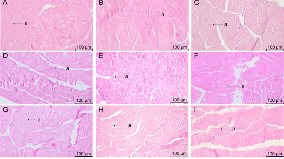 Hình 3: Những thay đổi của mô cơ ở tôm thẻ chân trắng L. vannamei sau 132 giờ tiếp xúc (phóng đại 200 lần). (A) Nhóm A1 (10 mg/L amoniac-N); (B) Nhóm A2 (20 mg/L amoniac-N); (C) Nhóm A3 (30 mg/L amoniac-N); (D) Nhóm Y1 (20 mg/L nitrit-N); (E) Nhóm Y2 (40 mg/L nitrit-N); (F) Nhóm Y3 (60 mg/L nitrit-N); (G) Nhóm S1 (2 mg/L sulfua); (H) Nhóm S2 (3mg/L sulfua); (1) Nhóm S3 (4mg/L sulfua); (a) hạt nhân.