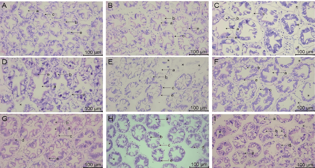 Hình 2: Những thay đổi của mô gan tụy ở tôm thẻ chân trắng L. vannamei sau 132 giờ tiếp xúc (phóng đại 200 lần). (A) Nhóm A1 (10 mg/L amoniac-N); (B) Nhóm A2 (20 mg/L amoniac-N); (C) Nhóm A3 (30 mg/L amoniac-N); (D) Nhóm Y1 (20 mg/L nitrit-N); (E) Nhóm Y2 (40 mg/L nitrit-N); (F) Nhóm Y3 (60 mg/L nitrit-N); (G) Nhóm S1 (2 mg/L sulfide); (H) Nhóm S2 (3mg/L sulfide); (1) Nhóm S3 (4mg/L sulfide). (a) Lòng ống gan tụy; (b) Tế bào tiết B; (c) Màng đáy; (d) Tế bào Restzellen; (e) Tế bào phôi E. Dấu hoa thị biểu thị sự hình thành không bào và sự co lại.