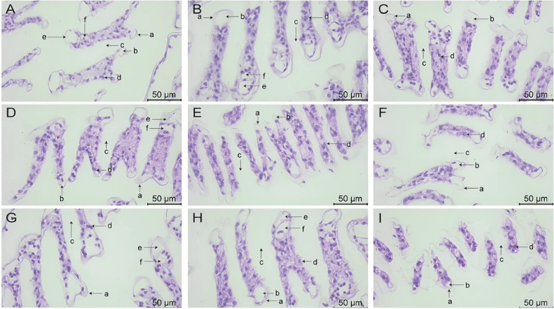 Hình 4: Những thay đổi của mô mang ở tôm thẻ chân trắng L. vannamei sau 132 giờ tiếp xúc (phóng đại 400 lần). (A) Nhóm A1 (10 mg/L amoniac-N); (B) Nhóm A2 (20 mg/L amoniac-N); (C) Nhóm A3 (30 mg/L amoniac-N); (D) Nhóm Y1 (20 mg/L nitrit-N); (E) Nhóm Y2 (40 mg/L nitrit-N); (F) Nhóm Y3 (60 mg/L nitrit-N); (G) Nhóm S1 (2 mg/L sulfua); (H) Nhóm S2 (3mg/L sulfua); (I) Nhóm S3 (4mg/L sulfua). (a) Biểu bì; (b) Tế bào biểu mô; (c) Cơ hoành; (d) Tế bào máu; (e) đi vào mạch mang; (f) thoát ra khỏi mạch mang.