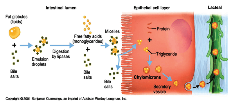 • Thúc đẩy tiêu hóa và hấp thu lipid: Là phân tử lưỡng tính, axit mật giúp nhũ hóa chất béo thành các hạt chylomicron nhỏ, tăng diện tích tiếp xúc với enzyme tiêu hóa và cải thiện hiệu quả tiêu hóa. Nó cũng kích hoạt lipase tuyến tụy và thúc đẩy hấp thu axit béo, glycerol.