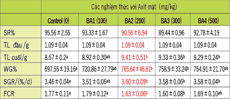 Nghiên cứu của Chen Su và cộng sự (2021) về hiệu quả của axit mật lên tăng trưởng, chuyển hóa lipid, miễn dịch và hệ vi sinh đường ruột của tôm thẻ chân trắng đã khẳng định hiệu quả nổi bật của việc bổ sung axit mật vào khẩu phần ăn của tôm thẻ chân trắng trong 60 ngày. Kết quả cho thấy, nhóm bổ sung 0,02% axit mật (độ tinh khiết 98%) đạt tăng trưởng vượt trội: trọng lượng cuối cùng cao hơn đối chứng 8,53%, tốc độ tăng trưởng đặc biệt (SGR) tăng 4,04%, tốc độ tăng trọng (WG) tăng 9,76%, trong khi FCR giảm 7,91%.