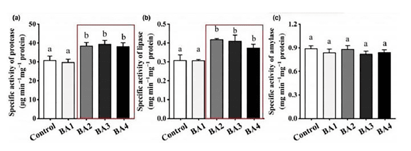Song song đó, khả năng tiêu hóa được cải thiện rõ rệt khi hoạt tính enzyme protease và lipase tăng đáng kể, giúp tôm hấp thu tốt hơn protein và chất béo từ khẩu phần ăn.