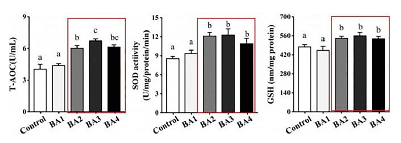 Đặc biệt, chỉ số miễn dịch và chống oxy hóa cũng được nâng cao, thể hiện qua sự gia tăng T-AOC, SOD và GSH trong huyết thanh, góp phần giúp tôm khỏe mạnh và chống chịu tốt hơn với stress cũng như mầm bệnh.