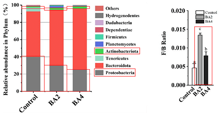 Cuối cùng, phân tích hệ vi sinh đường ruột cho thấy việc bổ sung axit mật đã giúp tăng cường vi khuẩn có lợi (Actinobacteriota) và ức chế vi khuẩn gây hại (Proteobacteria, bao gồm Vibrio), nhờ đó ổn định hệ tiêu hóa và giảm nguy cơ bệnh đường ruột.