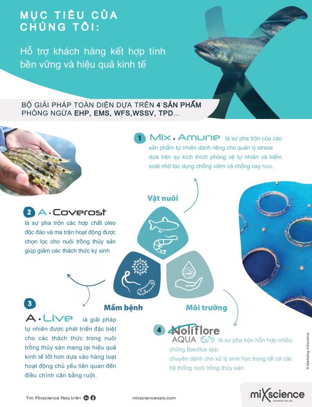 Công ty TNHH MiXscience Asia mang đến bộ 4 sản phẩm chuyên biệt giúp phòng ngừa các bệnh nguy hiểm như EHP, EMS, WFS, WSSV, TPD… và tối ưu sức khỏe vật nuôi: