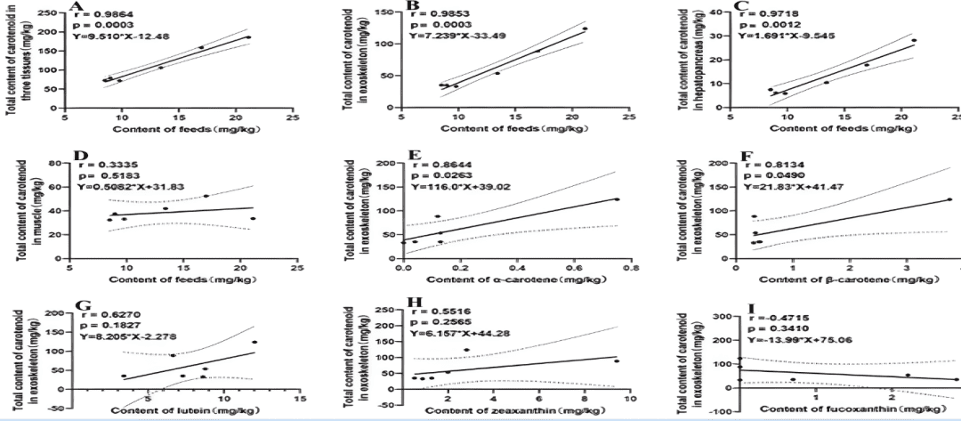 Hình 1: Phân tích tương quan Pearson của hàm lượng carotenoid giữa thức ăn và tôm thẻ chân trắng. Tương quan giữa tổng hàm lượng carotenoid trong ba mô và thức ăn (A); tương quan giữa tổng hàm lượng carotenoid trong lớp vỏ ngoài (B), gan tụy (C), cơ (D) và hàm lượng thức ăn. Tương quan giữa tổng hàm lượng carotenoid trong lớp vỏ ngoài và hàm lượng a-carotenoid (E), B-carotene (F), lutein (G), zeaxanthin (H) và fucoxanthin (1) trong thức ăn. Chuyển thể từ bản gốc.