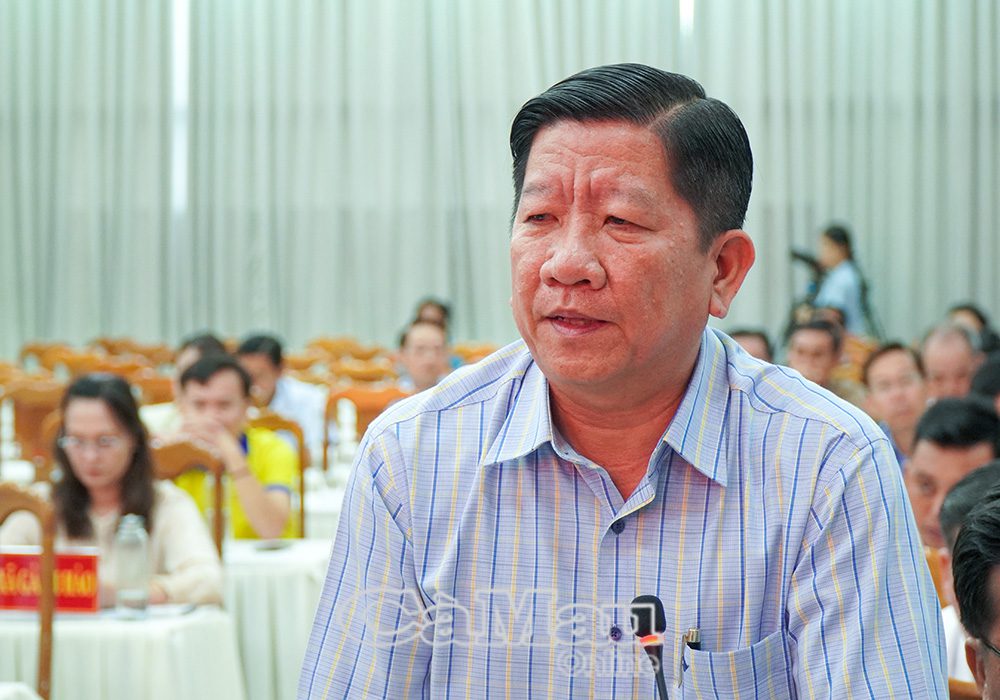 Ông Nguyễn Trí Tài, Chủ tịch UBND xã Đầm Dơi, nêu những thuận lợi, khó khăn trong triển khai mô hình RAS-IMTA tại địa phương. Ảnh: Báo Cà Mau