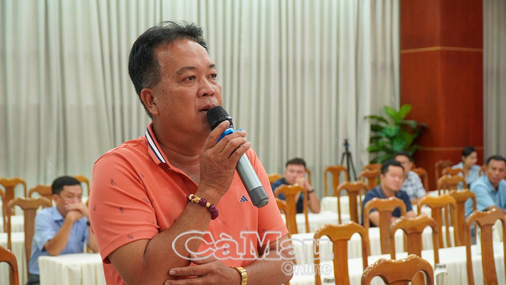 Ông Trần Huấn, Đại lý thức ăn tôm tại xã Đầm Dơi, kiến nghị nên triển khai thực nghiệm ở mỗi xã 2 mô hình RAS-IMTA. Ảnh: Báo Cà Mau