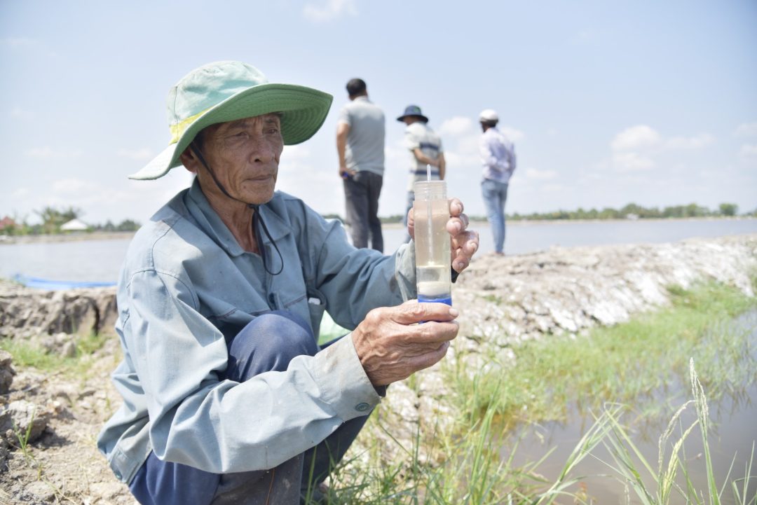 Ông Nguyễn Văn Hai, ngụ xã An Biên thường xuyên kiểm tra độ mặn trong vuông tôm. Ảnh: An Lâm