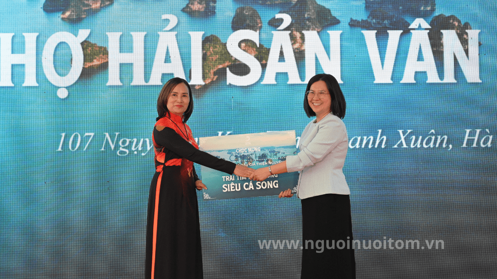 Bà Phạm Thị Thu Hiền trao chứng nhận đấu giá thiện nguyện siêu cá song nặng 29 kg cho đại diện Công ty TNHH Thủy hải sản Thanh Thủy (Quảng Ninh)