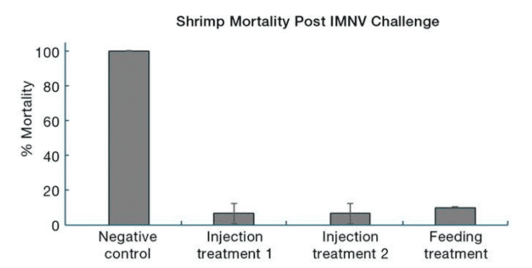 Nền tảng cung cấp bằng đường thức ăn của ViAqua đã được chứng minh có hiệu quả tương đương với tiêm phòng trong việc chống lại virus. Trong thử nghiệm đối kháng với IMNV, kết quả cho thấy hiệu quả rõ rệt trong việc giảm tỷ lệ chết của tôm. Như minh họa ở Hình 2, những con tôm được điều trị bằng RNA qua tiêm hoặc thức ăn đều có tỷ lệ sống 90%, so với 100% chết ở nhóm đối chứng. Việc cung cấp bằng đường miệng đã giảm tỷ lệ chết xuống chỉ còn 10%, cho thấy tiềm năng lớn để phòng bệnh trong thực tế.