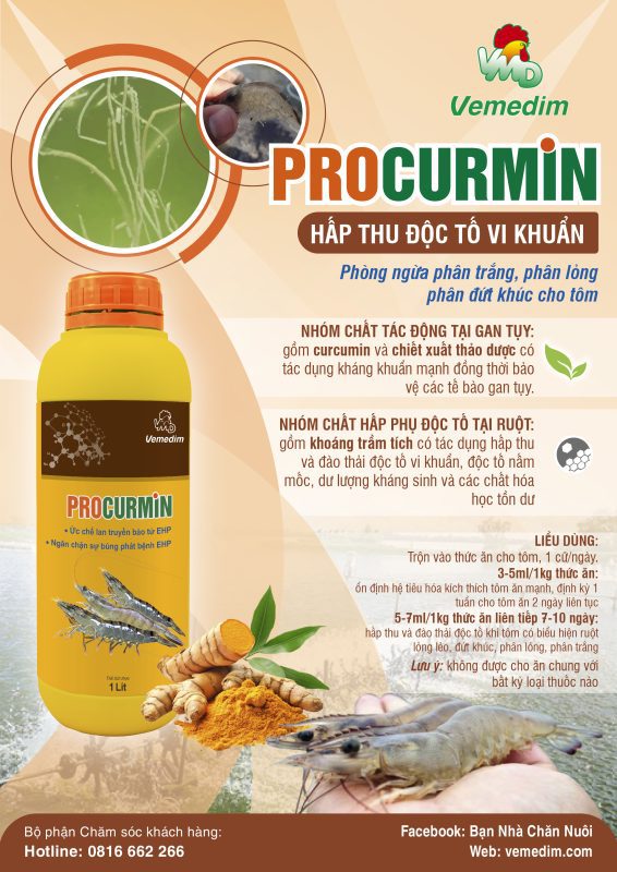 [Người Nuôi Tôm] – PROCURMIN là sản phẩm của Vemedim, được phát triển nhằm hỗ trợ hấp thu và đào thải độc tố vi khuẩn trong đường ruột tôm, qua đó góp phần phòng ngừa các hiện tượng phân trắng, phân lỏng, phân đứt khúc thường gặp trong quá trình nuôi.