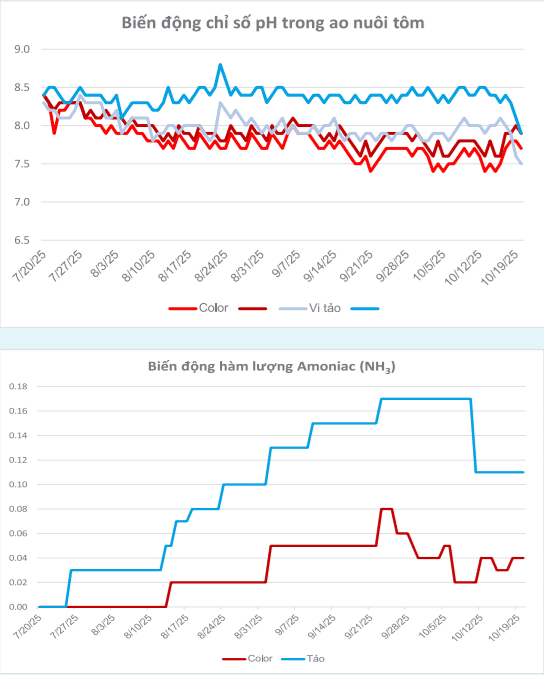 Sự ổn định pH – Chìa khóa vàng: Dữ liệu ghi nhận biên độ biến động pH hàng ngày tại các ao màu nhân tạo chỉ ở mức 0,14, trong khi ao dùng tảo lên tới 0,39. Điều này đồng nghĩa với việc môi trường ao màu nhân tạo ổn định gấp gần 3 lần. Nhờ pH ổn định, các kim loại nặng và khí độc trong ao cũng ít độc tính hơn, giúp tôm khỏe mạnh, vỏ bóng và cứng cáp sau khi lột xác.