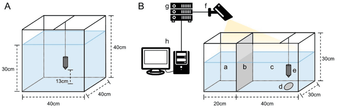 Hình 1: Hệ thống thu âm thanh (A) và hệ thống quan sát cho ăn (B). Lưu ý: khu vực cách ly (a), vách ngăn (b), khu vực quan sát (c), khay cho ăn (d), ống thủy âm (e), camera hồng ngoại (f), công tắc (g), màn hình giám sát và thiết bị lưu trữ (h).