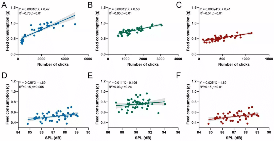 Hình 2: Mối quan hệ giữa lượng thức ăn tiêu thụ và số lần nhấp (A-C) và mức áp suất âm thanh (SPL, tính bằng dB) (D-F) trong 30 phút sau khi cho ăn bằng viên thức ăn, ở các nhiệt độ, nồng độ nitơ amoniac và nồng độ nitơ nitrit khác nhau.