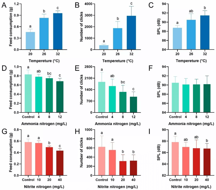 Hình 3: Sự khác biệt về lượng thức ăn tiêu thụ, số lần kêu lách cách và mức áp suất âm thanh (SPL, tính bằng dB) của tôm thẻ chân trắng P. vannamei trong 30 phút sau khi cho ăn viên ở các nhiệt độ khác nhau (A-C), nồng độ nitơ amoniac (D-F) và nồng độ nitơ nitrit (G-I). Các chữ cái thường khác nhau biểu thị sự khác biệt đáng kể giữa các nhóm xử lý (p < 0,05).
