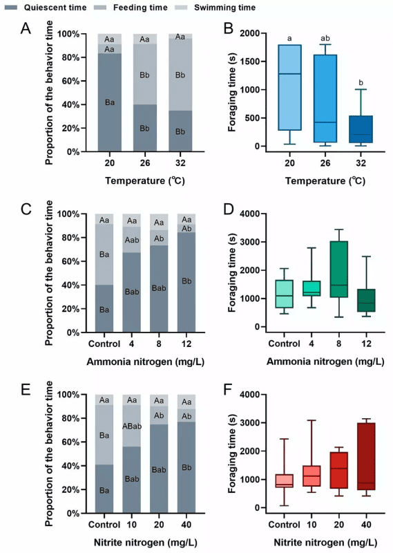 Hình 4: Tỷ lệ thời gian hành vi trên thời gian kiếm ăn của tôm thẻ chân trắng P. vannamei ở các nhiệt độ khác nhau (A, B), nồng độ nitơ amoniac (C, D) và nồng độ nitơ nitrit (E, F). Các chữ cái viết hoa khác nhau biểu thị sự khác biệt đáng kể giữa các hành vi trong cùng một nghiệm thức, trong khi các chữ cái viết thường khác nhau biểu thị sự khác biệt đáng kể trong cùng một hành vi giữa các nghiệm thức.