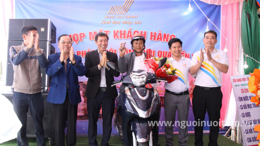 Đại diện Ngọc Việt Group và Đại lý Kim Sơn – Ngọc Bích trao tặng xe máy cho hộ nuôi tôm về đích với kích cỡ 30 con/kg