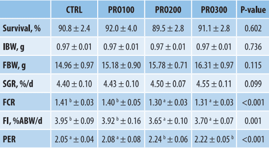 Ngược lại, chỉ tiêu hiệu quả sử dụng protein PER tăng khi bổ sung protease mức cao: từ 2,05 ở đối chứng lên 2,24 ở PRO200 và khoảng 2,22 ở PRO300, với p < 0,001. Như vậy, protease không làm thay đổi tăng trưởng một cách rõ rệt, nhưng có ảnh hưởng đáng kể đến hiệu quả chuyển hóa thức ăn và sử dụng đạm.