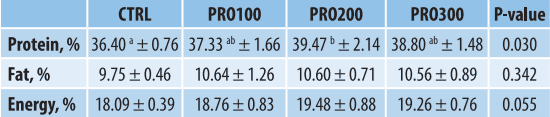 Khi phân tích sâu hơn ở mức giữ lại dinh dưỡng trong cơ thể, nhóm tác giả cho thấy tỷ lệ giữ lại protein toàn thân tăng nhẹ ở các nghiệm thức bổ sung enzyme. Giá trị giữ lại protein ở đối chứng là 36,40%, tăng lên 39,47% ở PRO200 và 38,80% ở PRO300. Trong đó, PRO200 cao hơn có ý nghĩa thống kê so với đối chứng, với p = 0,030. Các chỉ tiêu giữ lại lipid và năng lượng không có sự khác biệt đáng kể giữa các nghiệm thức. Kết quả này cho thấy protease hỗ trợ quá trình sử dụng protein theo hướng hiệu quả hơn, phản ánh qua việc tăng tỷ lệ giữ lại protein trong cơ thể.