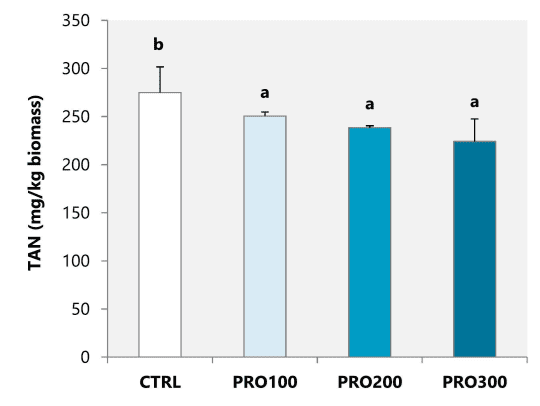 Hình 1. Tổng lượng amoniac bài tiết (TAN, mg/kg sinh khối)