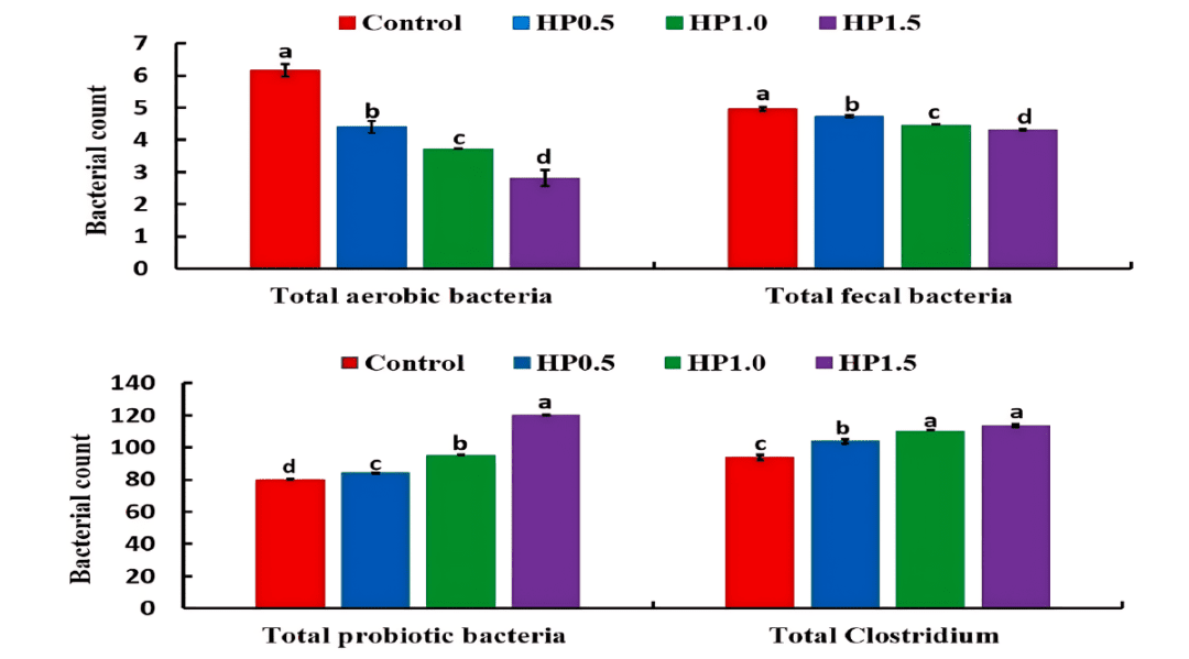 Bổ sung HP ảnh hưởng rõ rệt đến hệ vi sinh đường ruột của tôm thẻ chân trắng (P < 0,05). Cụ thể, khi tăng mức HP, số lượng vi khuẩn hiếu khí tổng và vi khuẩn phân giảm đáng kể, trong khi vi khuẩn có lợi (probiotic) và Clostridium tăng lên. Nhóm HP1.5 có kết quả cải thiện rõ rệt nhất.