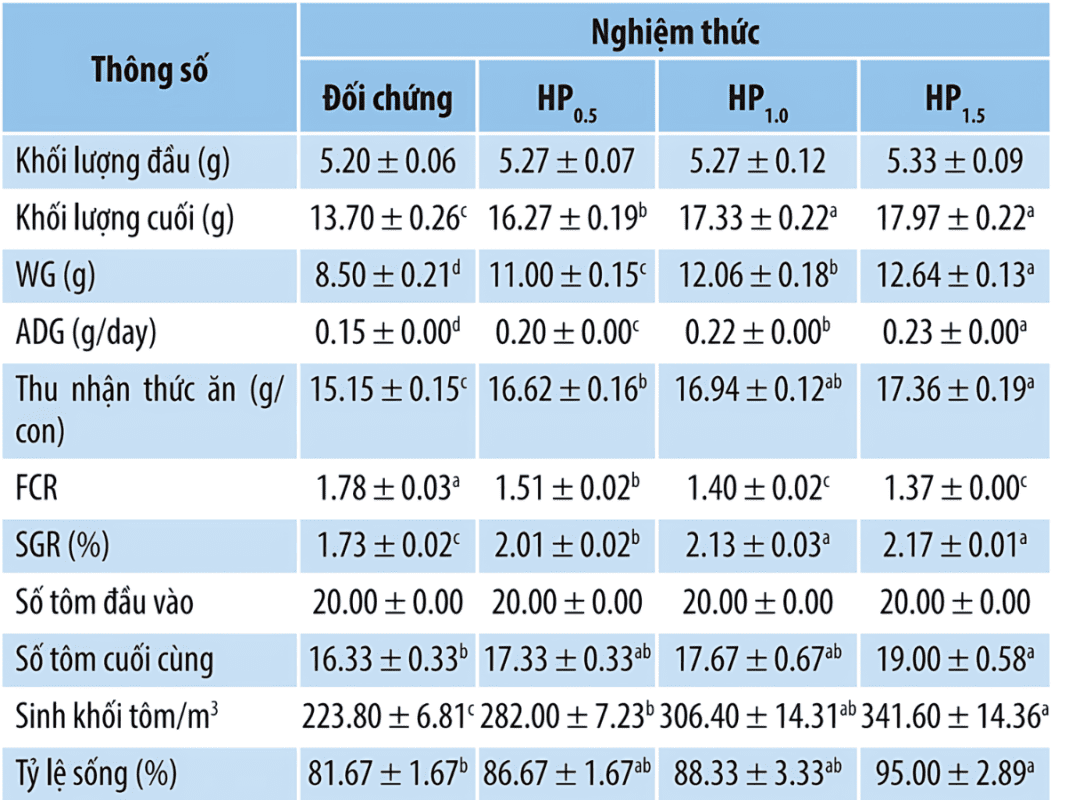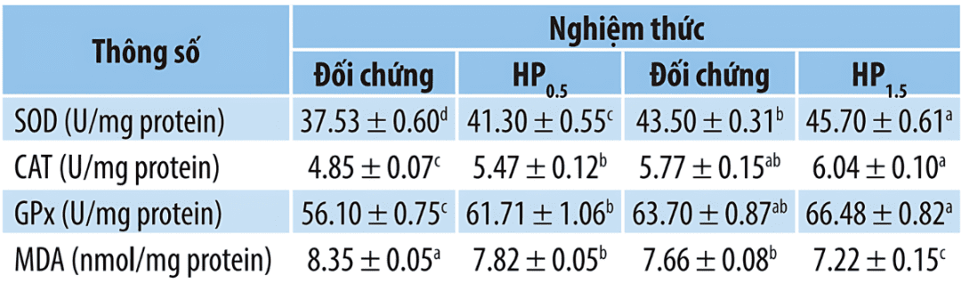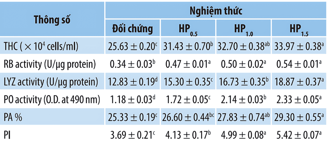 Sau 8 tuần bổ sung HP, các chỉ số chống oxy hóa (SOD, CAT, GPx) và miền dịch (THC, RB, LYZ, PO, PA%, PI) của tôm thẻ tăng đáng kể so với nhóm đối chứng (P <0,05). Đồng thời, mức MDA – chỉ thị cho quá trình peroxy hóa lipid – giảm rõ rệt. Nhóm bổ sung HP1.5 đạt kết quả cao nhất ở hầu hết các chỉ tiêu, ngoại trừ RB, không khác biệt đáng kể giữa các nhóm HP.