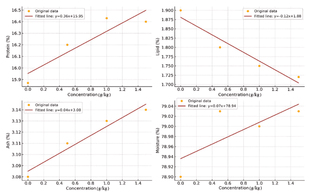 Hình 1: Biểu đổ đường thể hiện môi quan hệ giữa các mức bổ sung H. pluvialis (0, 0.5, 1.0 và 1.5 g/kg thức ăn) với các chỉ tiêu thành phần cơ thể (protein, lipid, tro và độ ẩm) của tôm thẻ chân trắng sau 8 tuần nuôi