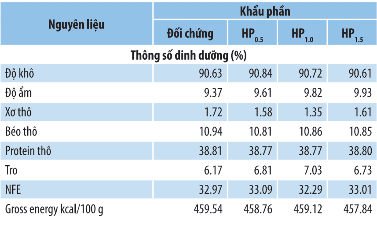 Bảng 1. Thành phần của chế độ ăn thử nghiệm (g/kg) và thành phần hóa học (%) với H. pluvialis (HP)