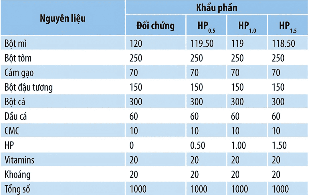 Thí nghiệm được phê duyệt bởi Hội đồng đạo đức nghiên cứu của Đại học Arish (ARU/Agri.28). Bột vi tảo Haematococcus pluvialis (HP) với hàm lượng astaxanthin 20 g/kg (trọng lượng khô) do Công ty Bioalgo (Trung Quốc) cung cấp được sử dụng. Bốn khẩu phần ăn được chuẩn bị, bổ sung HP ở các mức: 0.0 (đối chứng), 0.5 (HP0.5), 1.0 (HP1), và 1.5 g/kg thức ăn (HP1.5). Thành phần và phân tích hóa học chi tiết được trình bày trong Bảng 1. Tôm thẻ chân trăng giống (L. vannamei) được lấy từ một trang trại ở tỉnh Damietta và thích nghi với môi trường thí nghiệm trong 15 ngày. Tổng cộng 240 con tôm khỏe mạnh (trọng lượng trung bình 5,27 ± 0,12 g) được chia ngẫu nhiên vào 12 lồng lưới (1x1x1 m), mỗi lồng nuôi 20 con. Tôm được chia thành 4 nhóm (3 lồng/ nhóm), cho ăn 4 khẩu phần thử nghiệm trong 8 tuần, 3 lần/ngày (7h, 11h và 15h). Lượng thức ăn là 5% trọng lượng cơ thể trong 4 tuần đầu và giảm xuống 4% trong 4 tuần sau.