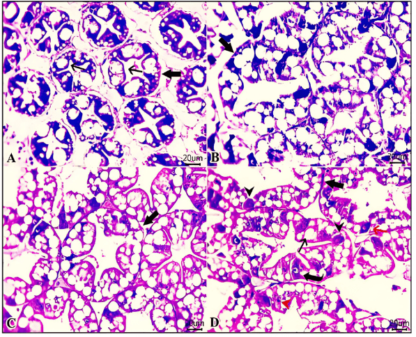Ở nhóm đối chứng, cấu trúc ống gan tụy của tôm được bảo tồn tốt, các tế bào biểu mô lót ống gồm nhiều loại: B-, R-, M-, F- và E-cells. B-cells có bào tương chứa không bào và nhân nằm đáy; R-cells có dạng lăng trụ, bào tương ái toan và nhân đáy; M-cells hình tam giác, bào tương ái kiềm và nhân trung tâm; F-cells kéo dài với cực đỉnh chạm lòng ống; E-cells có nhân lớn chiếm phần lớn bào tương. Đáng chú ý, số lượng túi tiết trong B-cells tăng dần ở các nhóm HP (HP0.5, HP1.0 và HP1.5).