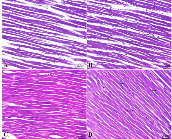 Hình 4. Ảnh hiển vi mô cơ của tôm thẻ chân trắng sau 8 tuần cho ăn H. pluvialis (HP). [A): Cấu trúc mô học bình thường của sợi cơ và mô kẽ ở nhóm đối chứng. [B, C, D]: Độ dày sợi cơ tăng dần ở các nhóm bổ sung HPO.5, HP1.0 và HP1.5. Nhuộm H&E; thước tỷ lệ: 20 m. Các nhóm tôm được cho ăn HP ở mức 0, 0.5, 1.0 và 1.5 g/kg thức ăn.