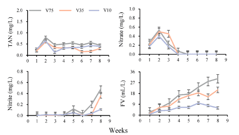 Kết quả nghiên cứu cho thấy, các thông số chất lượng nước ở tất cả các nhóm thí nghiệm đều dao động trong giới hạn phù hợp cho nuôi tôm thẻ chân trắng Litopenaeus vannamei. Thể tích bông cặn (FV), phản ánh tổng thể tích bông floc chiếm giữ trong cột nước, là chỉ tiêu quan trọng để đánh giá mật độ và mức độ kết tụ của sinh khối trong hệ thống. Chỉ số này cho phép theo dõi mối quan hệ cân bằng giữa sinh khối vi sinh vật và nguồn dinh dưỡng sẵn có, từ đó đảm bảo điều kiện thuận lợi cho quá trình sinh trưởng và trao đổi chất của vi sinh vật. Trong nghiên cứu này, FV thể hiện mối tương quan thuận với cường độ sục khí và đạt giá trị cao nhất ở nghiệm thức V75, phù hợp với các kết quả đã được ghi nhận trong những nghiên cứu trước đó. FV cao thường phản ánh sự hiện diện của cộng đồng vi sinh vật phát triển mạnh, có khả năng khai thác và tái chế dinh dưỡng hiệu quả, qua đó góp phần cải thiện chất lượng nước và nâng cao tính ổn định tổng thể của hệ thống nuôi.