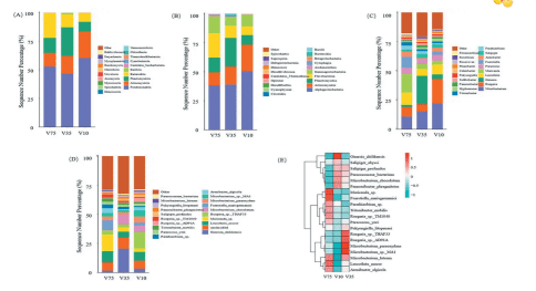 Hình 2: Thành phần và mật độ của quần thể vi sinh vật trong các nhóm cường độ sục khí khác nhau. (A) Cấp độ ngành; (B) Cấp độ lớp; (C) Cấp độ chi; (D) Cấp độ loài; (E) Bản đồ nhiệt về mật độ các loài vi khuẩn ở cấp độ loài. Được điều chỉnh từ hình gốc