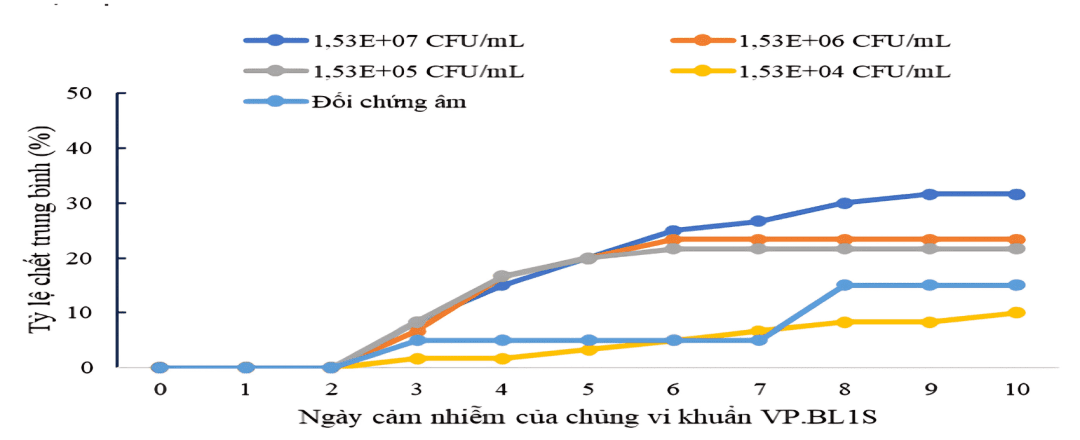 Khác với 2 chủng vi khuẩn trên, mặc dù kết quả gây nhiễm chủng VP.BL1S. (V. parahaemolyticus) tỷ lệ chết trung bình giữa các nghiệm thức và đối chứng âm có sự khác biệt nhưng không quá lớn, đặc biệt không có nghiệm thức nào tỷ lệ chết trung bình vượt quá 50%.