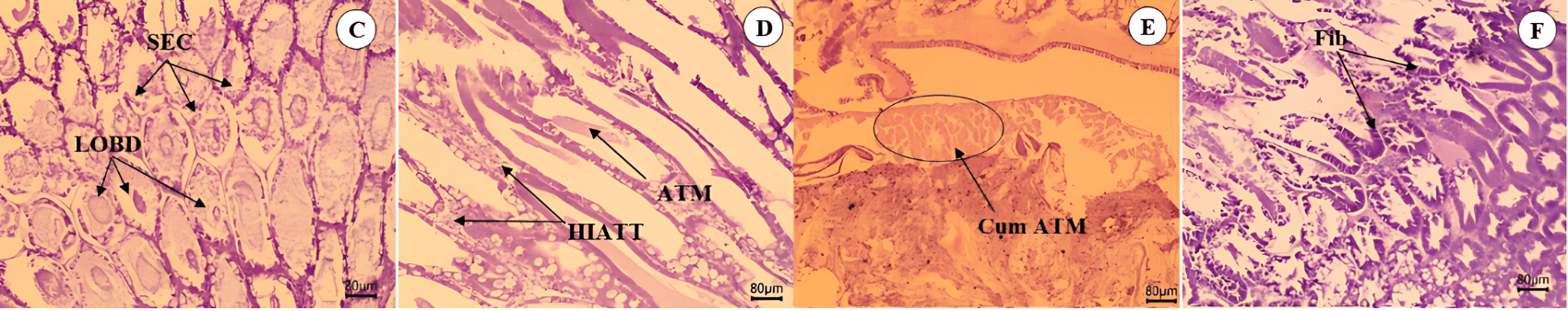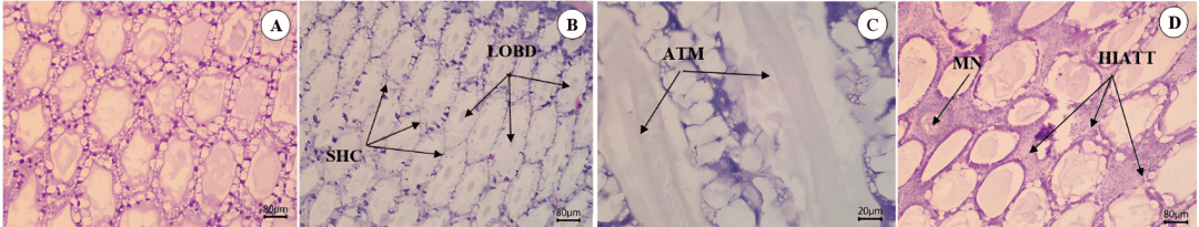 Kết quả cho thấy, mô học của các nghiệm thức gây bệnh tương tự mẫu thực địa, dù không xuất hiện triệu chứng phân trắng. Đáng chú ý, thể ATM cũng được phát hiện ở mẫu đối chứng âm, cho thấy ATM không chỉ xuất hiện ở tôm bị hội chứng phân trắng mà còn có thể thấy ở tôm khỏe, nhưng mức độ tổn thương thấp – phù hợp với kết quả nghiên cứu của Natthinee và cộng sự (2022).