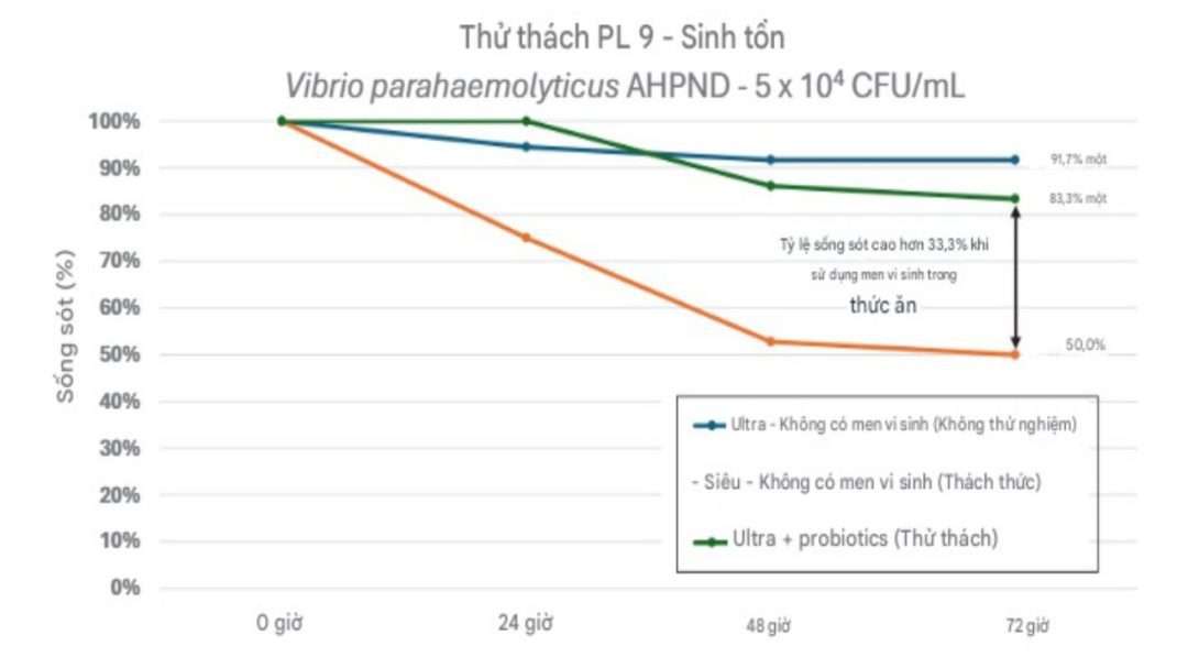 Tại giai đoạn PL9, ấu trùng được thử thách bằng cách ngâm trong dung dịch chứa Vibrio parahaemolyticus AHPND (5×10* CFU/mL trong 24 giờ). Sau 72 giờ, nhóm đối chứng có tỷ lệ sống 50%, trong khi nhóm dùng probiotic đạt 83,3%, cải thiện 33,3%. Kết quả này chứng minh probiotic trong thức ăn lỏng có khả năng xâm chiếm ruột hiệu quả và giúp giảm đáng kể tỷ lệ tử vong. Đồng thời, phương pháp bổ sung qua thức ăn cho thấy hiệu quả bảo vệ vượt trội so với chỉ xử lý nước.