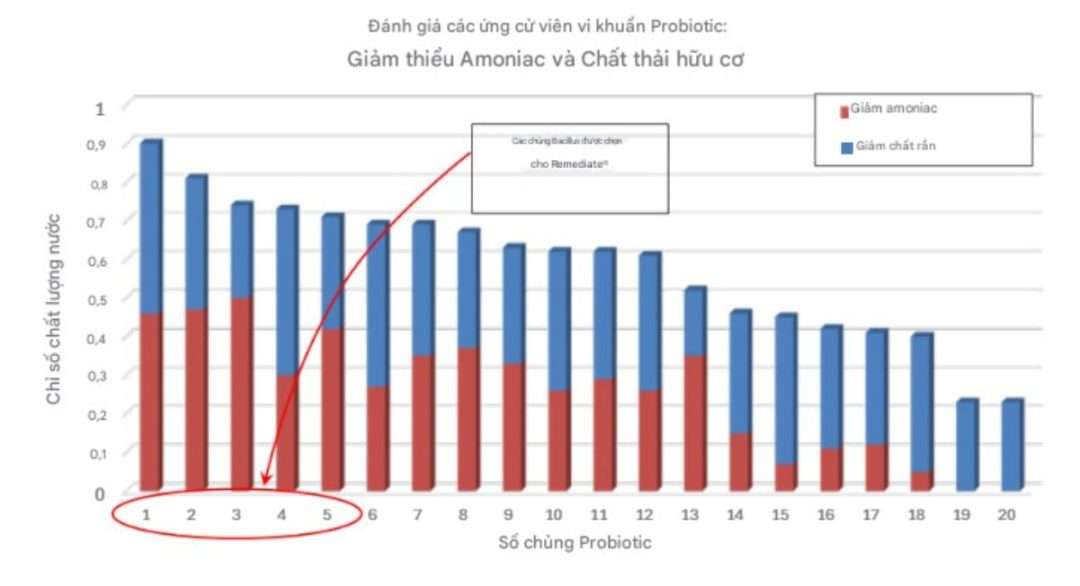 Bốn chủng có hiệu suất tốt nhất đã được đưa vào chế phẩm sinh học Rescue. Tương tự như vậy, nhiều chủng Bacillus đã được đánh giá về khả năng giảm nồng độ amoniac và tiêu hóa vật liệu hữu cơ (Hình 2), với năm chủng được chọn để đưa vào chế phẩm sinh học Remediate. Việc lựa chọn chủng có mục tiêu này đảm bảo rằng, mỗi sản phẩm mang lại hiệu suất tối đa khi sử dụng theo mục đích dự định.