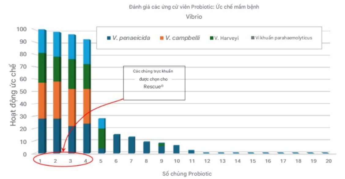 Một phương pháp hiệu quả hơn để bảo vệ tôm khỏi nhiễm trùng Vibrio là bổ sung vi khuẩn probiotic trực tiếp vào thức ăn. Cách tiếp cận này cho phép lợi khuẩn xâm nhập vào ruột, thiết lập hàng rào bảo vệ chống lại mầm bệnh ngay tại điểm xâm nhập. Dù việc đo mức độ xâm chiếm ở ấu trung tôm khá khó khăn, nghiên cứu của Zeigler và Đại học Philippines Visayas cho thấy, khi ấu trùng tôm thẻ chân trắng Litopenaeus vannamei được cho ăn thức ăn phủ men vi sinh Rescue (5×10° CFU/g thức ăn), Bacillus spp. có thể nhanh chóng xâm chiếm thành ruột, đạt mật độ 1×10> CFU/g mô ruột chỉ trong 7 ngày.