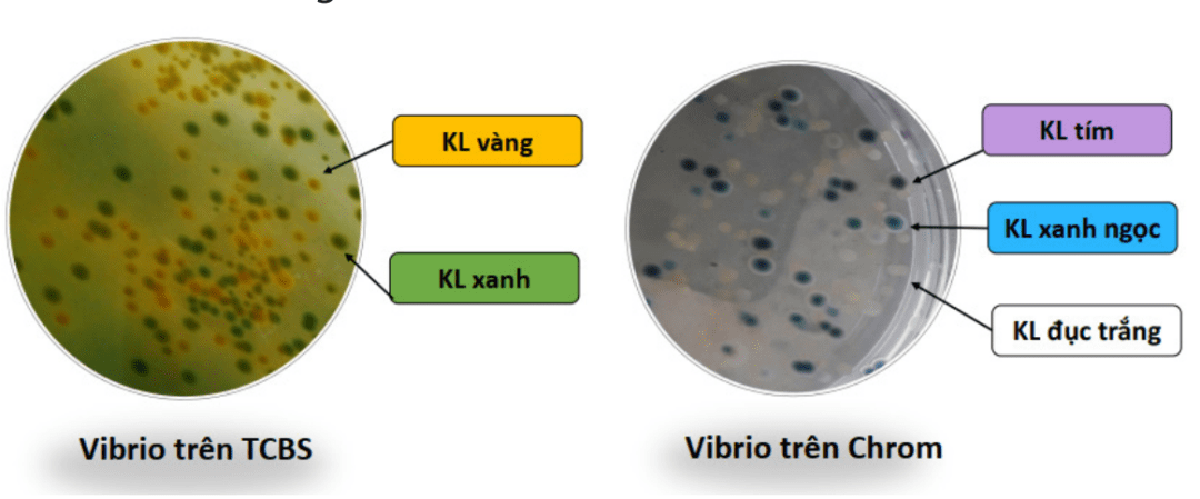 Khuẩn lạc tím: V. parahaemolyticus, Khuẩn lạc xanh ngọc: V. vulnificus Khuẩn lạc trắng đục: V. harveyi, V. alginolyticus, |