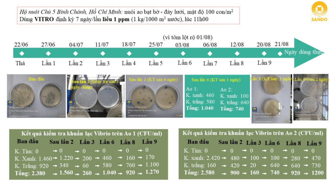 • Ví dụ như farm anh Long (Cần Giuộc, Long An): Sau khi dùng Vitro 1,3 ppm, mật độ Vibrio giảm từ 1.000 CFU/mL xuống chỉ còn 355 CFU/mL sau 24 giờ.