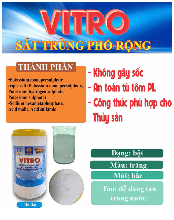 Vitro là một giải pháp sát trùng an toàn, thân thiện với ao nuôi. Đây là công thức sát trùng dạng bột chứa nhiều thành phần có khả năng sát trùng phổ rộng tiêu diệt vi khuẩn, virus, nấm, ký sinh trùng. Ưu điểm là có thể dùng trực tiếp ao đang có tôm, kế cả tôm Post, tôm con mà không ảnh hưởng đến tảo và môi trường.
