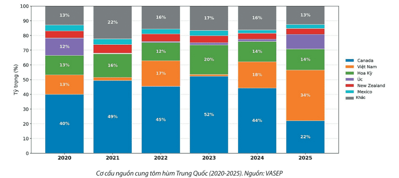 Thứ hai là sự thay đổi trong lợi thế cạnh tranh giữa các nguồn cung, đặc biệt liên quan đến chính sách thuế và logistics. Theo VASEP, một trong những biến số quan trọng nhất của năm 2025 là việc Trung Quốc áp thuế bổ sung 25% đối với nhiều mặt hàng thủy sản của Canada, trong đó có tôm hùm, bắt đầu từ ngày 20/3/2025.